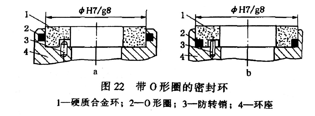 這種組合式密封環在硬質合金環與環座之間用H7/g8的滑動配合。在兩者配合的圓柱面間放置一聚四氟乙烯或合成橡膠制成的O形密封圈,避免其間的密封流體泄露,并且將硬質合金環與環座結合在一起。在硬質合金環與環座的平面結合處設一銷釘,以傳遞扭矩。此種組合結構,沒有組合應力產生,也無由此引起的組合密封環的密封端面的變形,可是組合密封環零件的數量增加了,還需要在硬質合金環上鉆孔或槽,給制造提高了難度,另外由于增設了O形圈,密封環的使用溫度受到了限制。