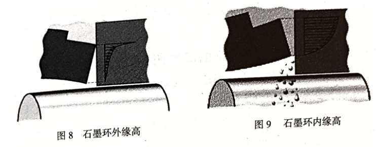 石墨環(窄環)外緣高(上張口),端面間隙呈喇叭形(圖8);石墨環的內緣(下張口)高(圖9),摩擦痕跡不連續,或局部接觸,有時出現大半圓(俗稱馬蹄形),密封泄漏。
