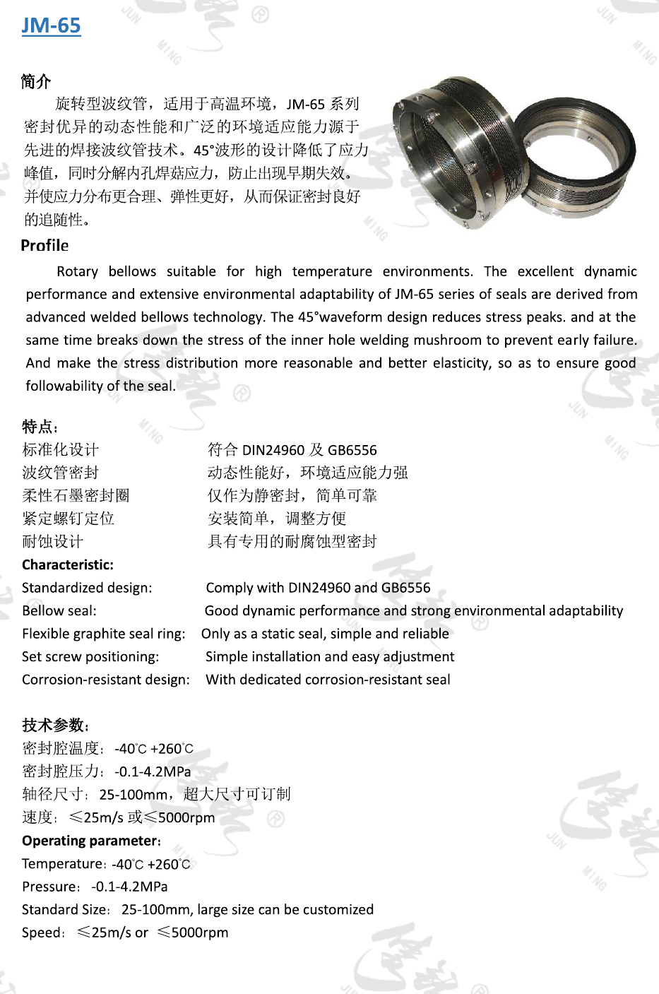 旋轉(zhuǎn)型波紋管,適用于高溫環(huán)境,JM-65系列密封優(yōu)異的動態(tài)性能和廣泛的環(huán)境適應能力源于先進的焊接波紋管技術(shù)。45°波形的設(shè)計降低了應力峰值,同時分解內(nèi)孔焊菇應力,防止出現(xiàn)早期失效。并使應力分布更合理、彈性更好,從而保證密封良好的追隨性。