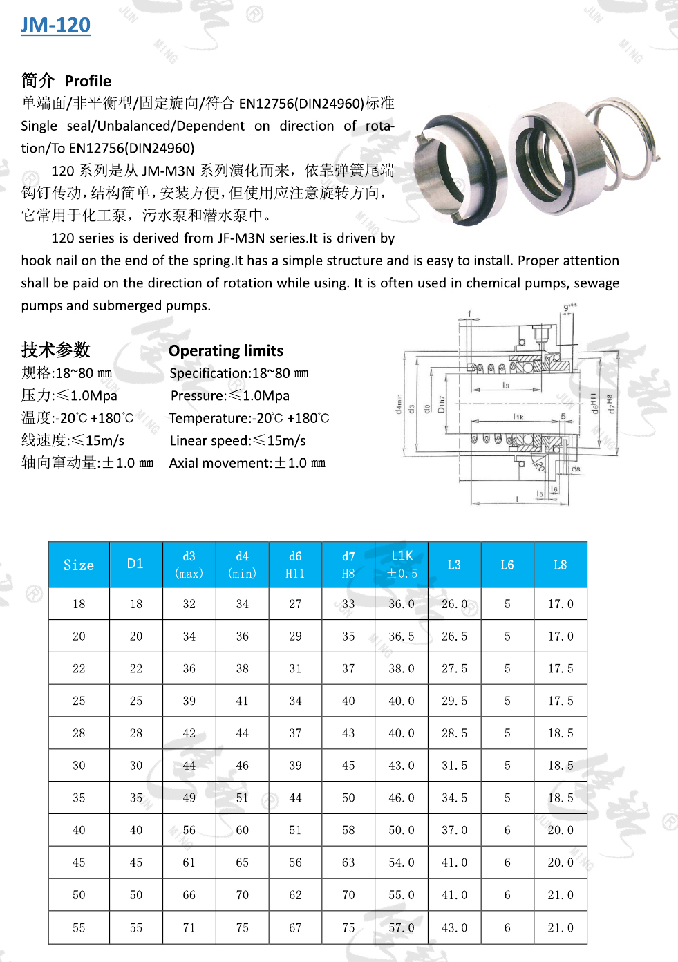 單端面/非平衡型/固定旋向/符合EN12756(DIN24960)標準。 120系列是從JM-M3N系列演化而來,依靠彈簧尾端鉤釘傳動,結構簡單,安裝方便,但使用應注意旋轉方向,它常用于化工泵,污水泵和潛水泵中。