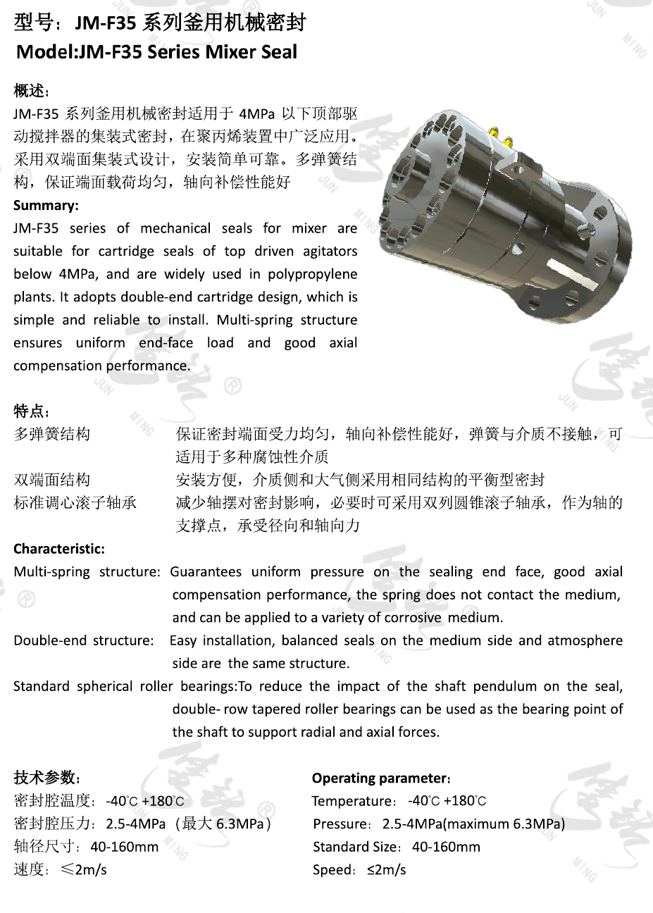 JM-F35系列釜用機械密封適用于4MPa以下頂部驅動攪拌器的集裝式密封,在聚丙烯裝置中廣泛應用。采用雙端面集裝式設計,安裝簡單可靠。多彈簧結構,保證端面載荷均勻,軸向補償性能好