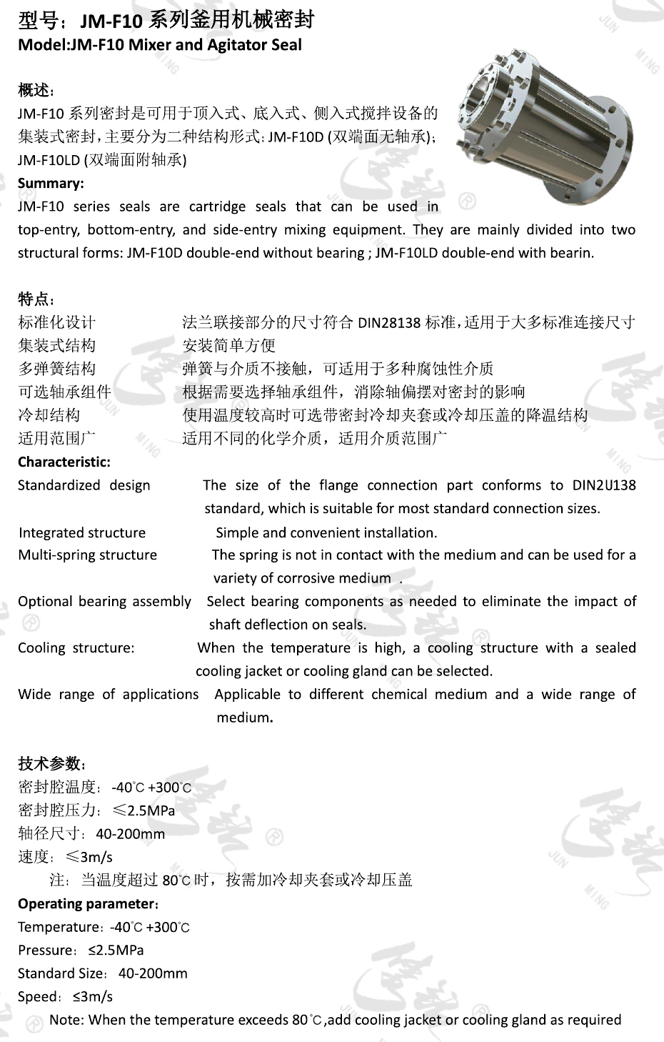 JM-F10系列密封是可用于頂入式、底入式、側(cè)入式攪拌設(shè)備的集裝式密封,主要分為二種結(jié)構(gòu)形式:JM-F10D (雙端面無軸承);JM-F10LD (雙端面附軸承)