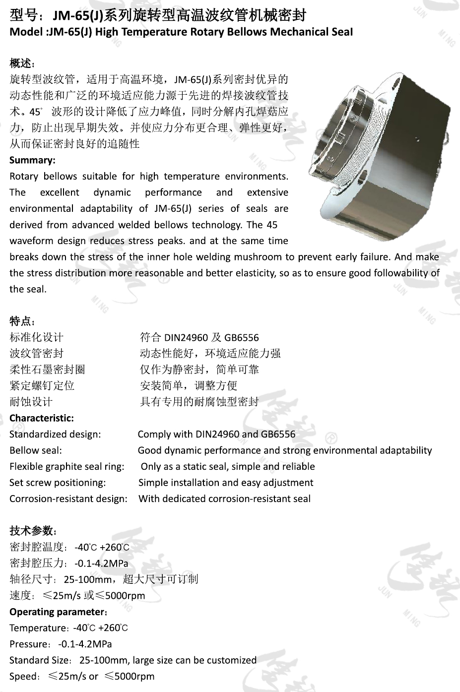旋轉型波紋管,適用于高溫環境,JM-65(J)系列密封優異的動態性能和廣泛的環境適應能力源于先進的焊接波紋管技術。45°波形的設計降低了應力峰值,同時分解內孔焊菇應力,防止出現早期失效。并使應力分布更合理、彈性更好,從而保證密封良好的追隨性