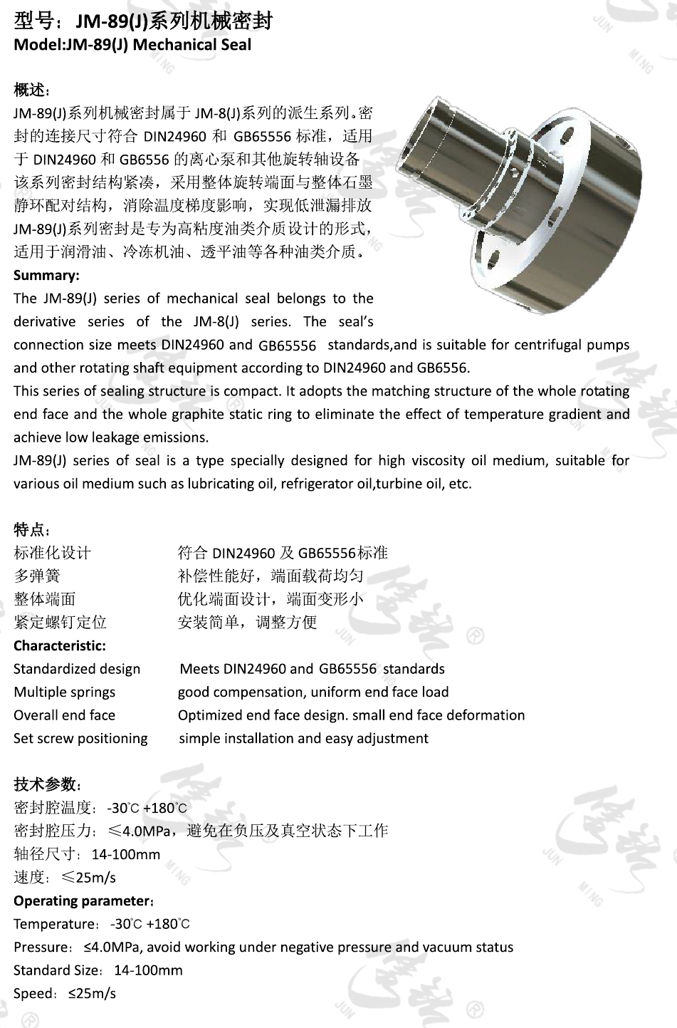 JM-89(J)系列機械密封屬于JM-8(J)系列的派生系列。密封的連接尺寸符合DIN24960和GB65556標準,適用于DIN24960和GB6556的離心泵和其他旋轉軸設備 該系列密封結構緊湊,采用整體旋轉端面與整體石墨靜環配對結構,消除溫度梯度影響,實現低泄漏排放 JM-89(J)系列密封是專為高粘度油類介質設計的形式,適用于潤滑油、冷凍機油、透平油等各種油類介質。
