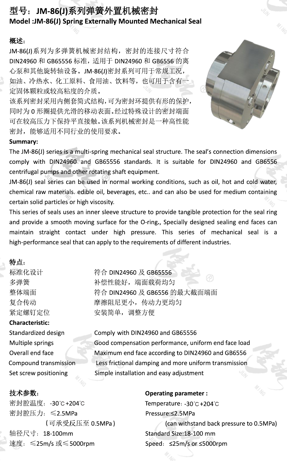 JM-86(J)系列為多彈簧機械密封結構,密封的連接尺寸符合DIN24960和GB65556標準,適用于DIN24960和GB6556的離心泵和其他旋轉軸設備。JM-86(J)密封系列可用于常規工況,如油、冷熱水、化工原料、食用油、飲料等,也可用于含有一定固體顆粒或較高粘度的介質。