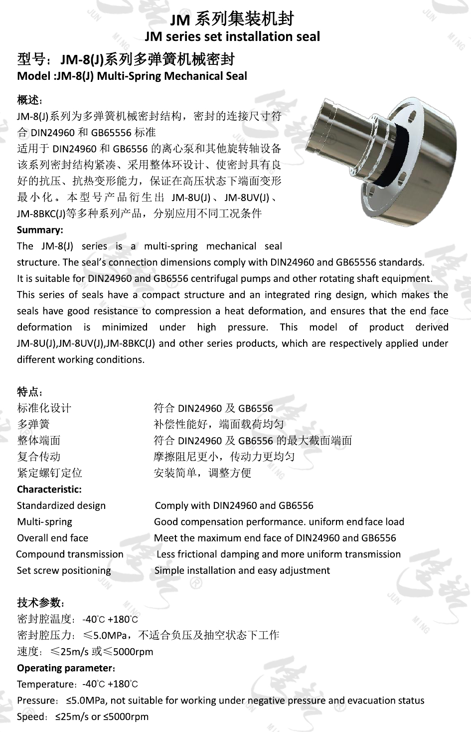 該系列密封結(jié)構(gòu)緊湊、采用整體環(huán)設(shè)計、使密封具有良好的抗壓、抗熱變形能力,保證在高壓狀態(tài)下端面變形最小化。本型號產(chǎn)品衍生出JM-8U(J)、JM-8UV(J)、JM-8BKC(J)等多種系列產(chǎn)品,分別應(yīng)用不同工況條件