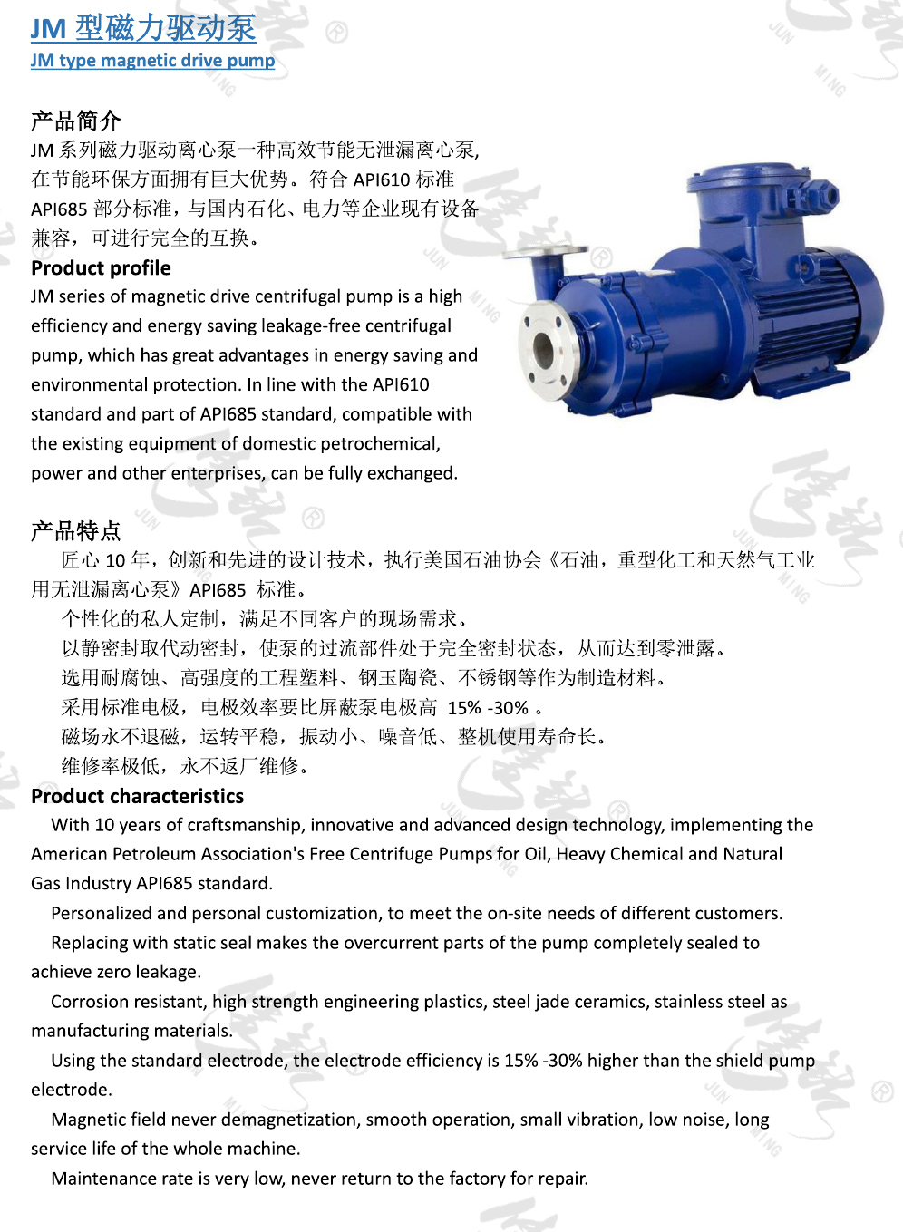 JM系列磁力驅動離心泵一種高效節能無泄漏離心泵, 在節能環保方面擁有巨大優勢。符合API610標準API685部分標準,與國內石化、電力等企業現有設備兼容,可進行完全的互換。
